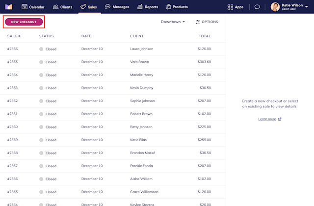 To complete a product return and refund to the client's account balance, open the Sales app and select New Checkout.