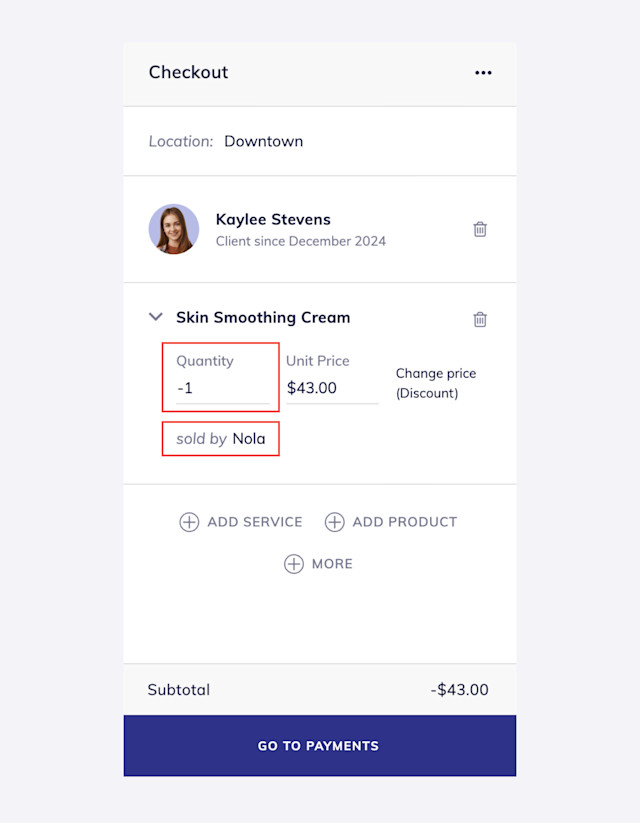 If you pay your staff members product commission, select the staff member who originally sold the product. This will deduct the product commission for the appropriate staff member.