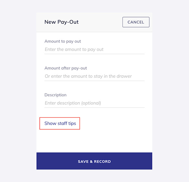 Select Pay out next to the staff member and select Save & Record. The payout will be deducted from your cash drawer total.