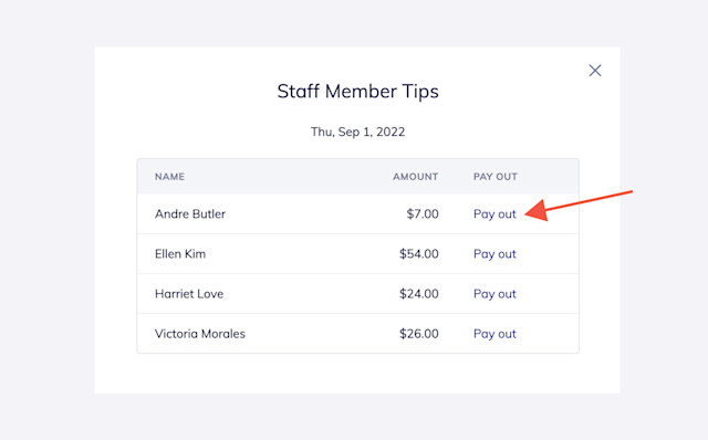 You can pay out a staff member's tips in cash from the cash drawer. This should be done at the end of the day or at the end of the staff member's shift.