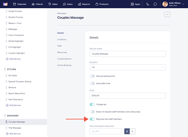 To create a couples service, such as a couples massage, enter the service details and enable the Requires two staff members toggle under Additional options. This will require two staff members to be selected to book the service.
