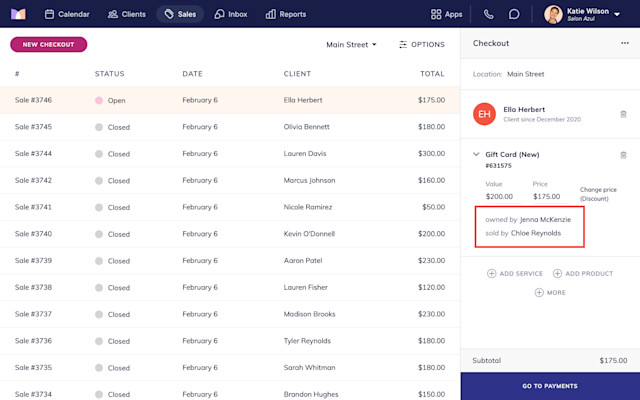 If needed, specify the gift card owner (recipient) and the staff member who sold the gift card. Specifying an owner is helpful if the client is purchasing the gift card for someone else.