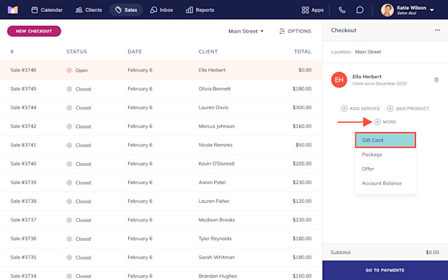 To apply a discount to a gift card during checkout, select More > Gift Card.