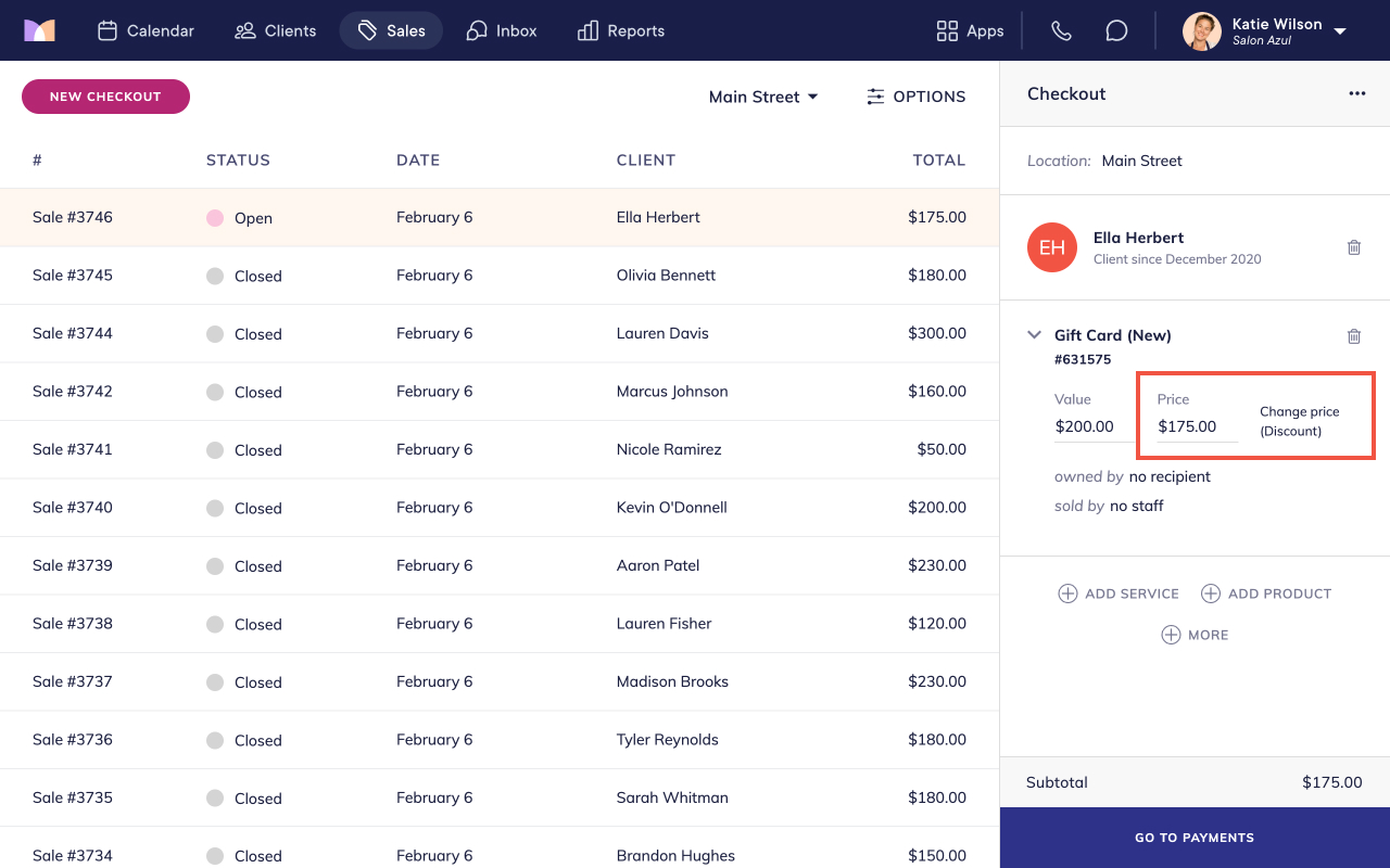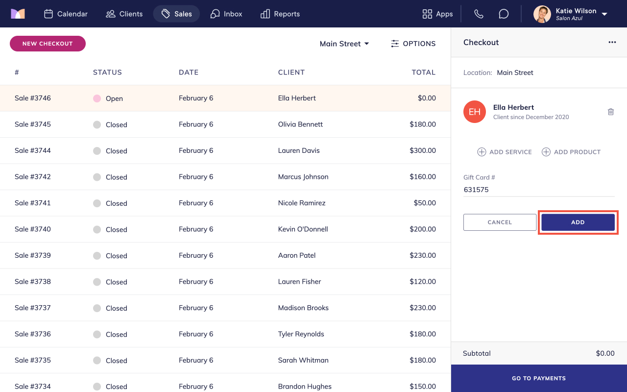If needed, specify the gift card owner (recipient) and the staff member who sold the gift card. Specifying an owner is helpful if the client is purchasing the gift card for someone else.