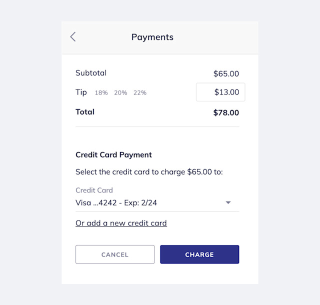 To charge a card on file, go to the Payments screen and select Credit Card. The Credit Card payment button is only available if you have signed up for payment processing.