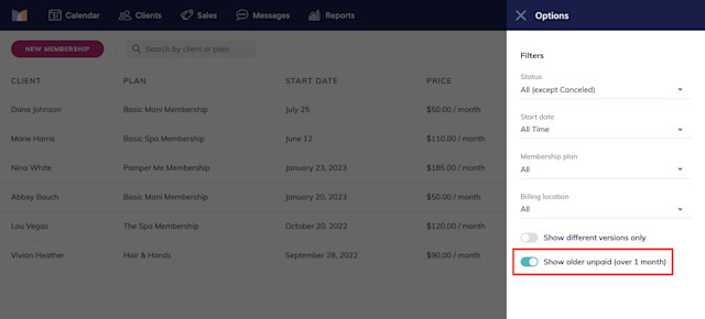 Memberships that are Unpaid for over one month are hidden in the Memberships app by default. To change this, open the Memberships app and select Options.