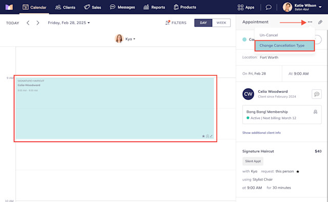 If a client cancels an appointment through the client portal, it is considered a Normal Cancellation, regardless of the time selected for the Late Cancellations setting. If you need to change a Normal Cancellation to a Late Cancellation, select Change Cancellation Type from the "..." menu.