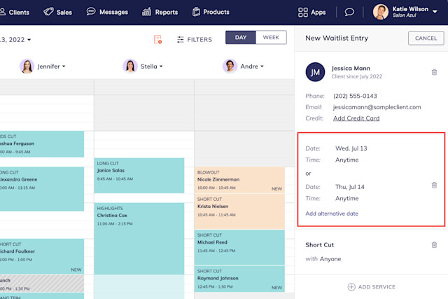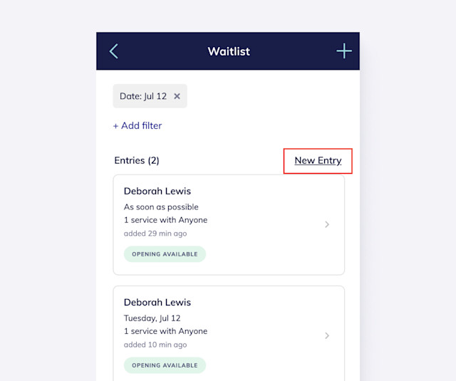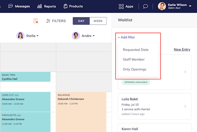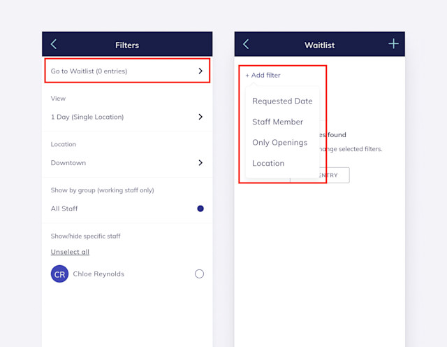 You can use the waitlist filters to search for waitlist entries by date, staff member, and location. You can also view waitlist entries with available openings.
