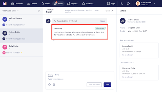 The phone call will display an auto-generated summary, allowing staff members to see the main topics that were discussed in the call.