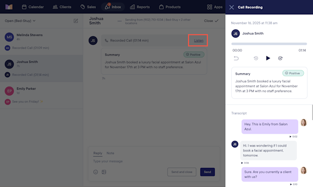 To listen to a recorded phone call, open the client’s conversation and locate the recorded phone call.