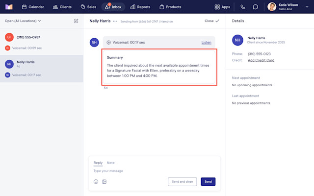 The voicemail will display an auto-generated Summary, which can be helpful for front desk staff to quickly see why the client called.