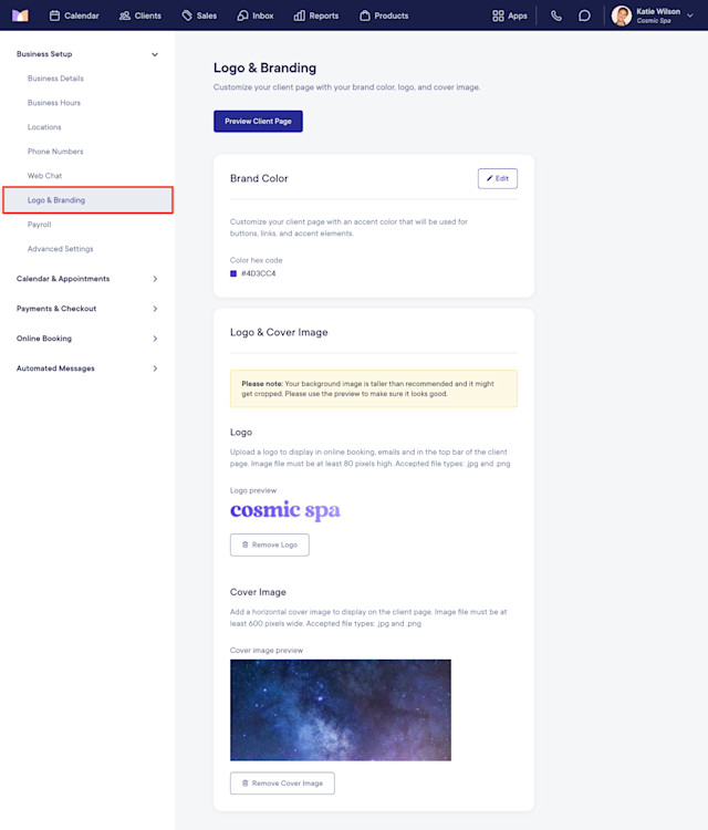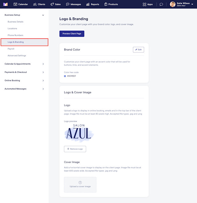 Your logo will be displayed in online booking, automated email messages, and at the top of the client portal. It will also be visible when using Express Booking™ and Client Self Checkout.