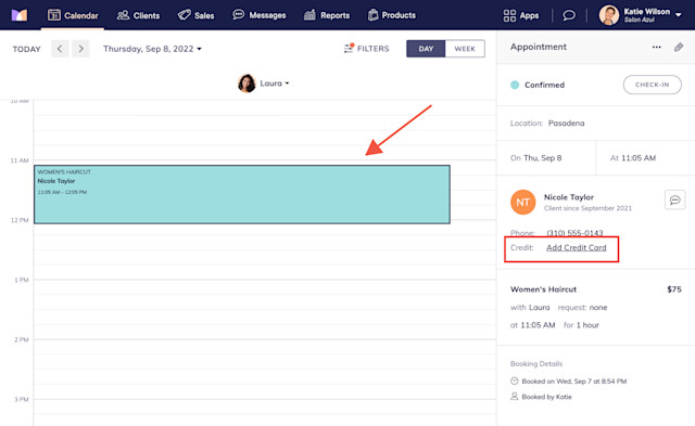 To add a card on file from the calendar, select the appointment and select Add Credit Card.
