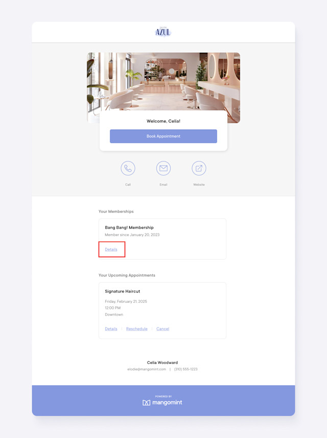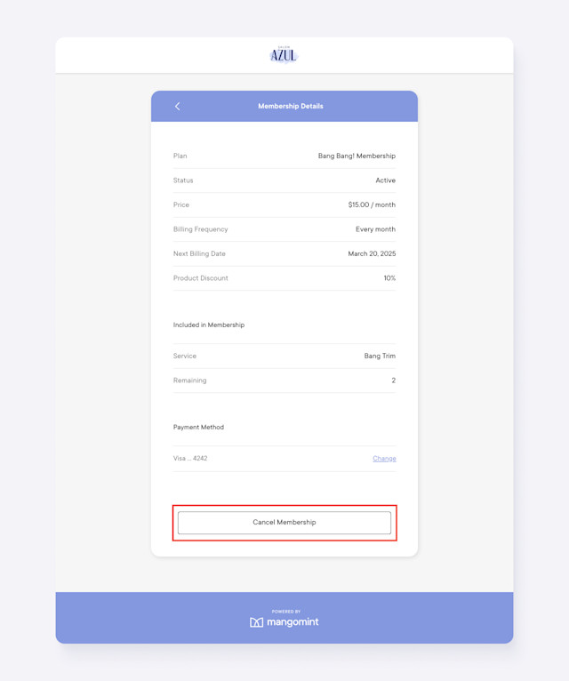 Clients can view their membership details, update their membership payment method, and cancel their membership through the client portal.