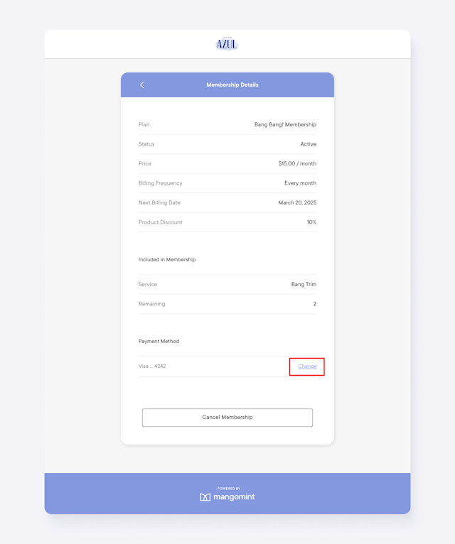 Clients can select Change to update their membership payment method.