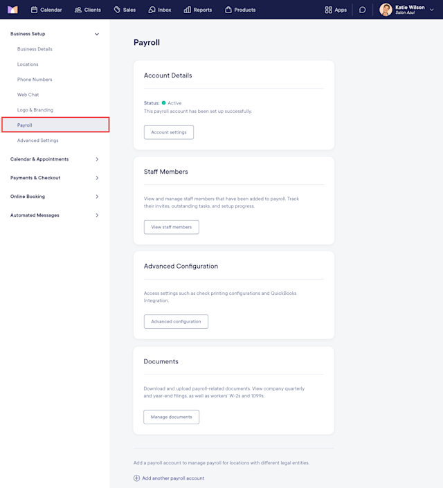 To view or update your payroll account details, open the Settings app and select Business Setup > Payroll > Account settings. If you have multiple payroll accounts, select Manage account > Account settings.
