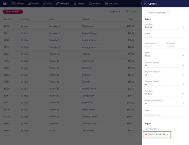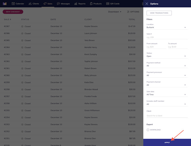 To filter the sales list, select the Options menu. Adjust the filters as needed and select Apply.