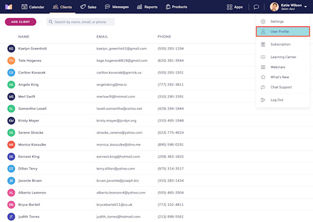 In the Clients app, you can add new clients, search for existing clients, and view client details including contact information and client notes.