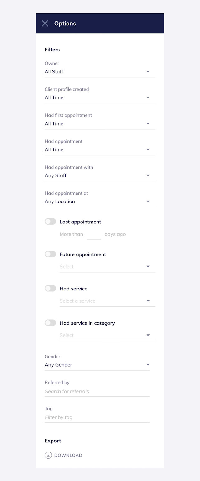 To filter the client list, select Options. Update the filters as needed and select Apply. To reset the filters, select Reset to default filters.