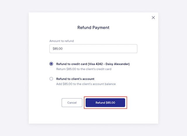 Select Refund to complete the refund and return the funds to the client. If you refunded to the client's credit card, the client should see the refund in their bank account in a few business days, depending on their bank.