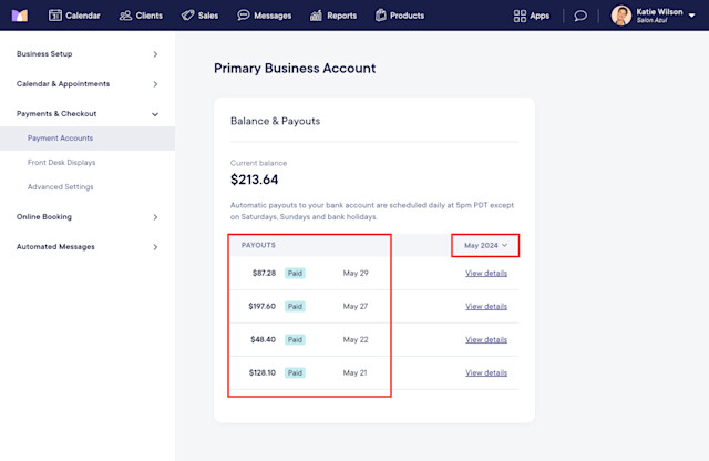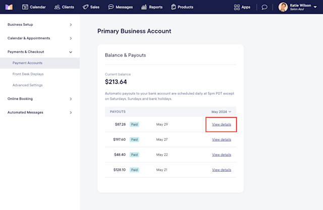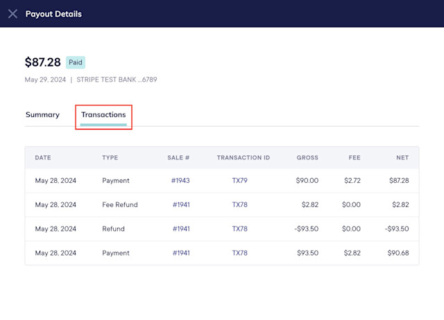 To view transactions and fees, select View details next to a payout.
