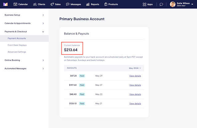 To view your current balance and payouts, open the Settings app and select Payments & Checkout > Payment Accounts > Manage account.