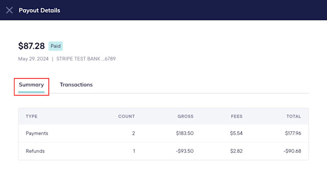 The Summary tab includes a breakdown of transactions, fees, and refunds.