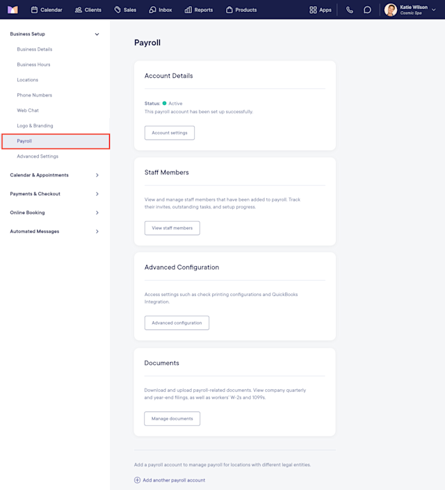 To view or update your payroll account details, open the Settings app and select Business Setup > Payroll > Account settings. If you have multiple payroll accounts, select Manage account > Account settings.