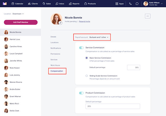 Once each payroll account is signed up for Payroll Processing and completed onboarding, open the Staff Members app and select the Compensation tab. Make sure the correct compensation is set up for any staff members who work at multiple locations assigned to different payroll accounts.