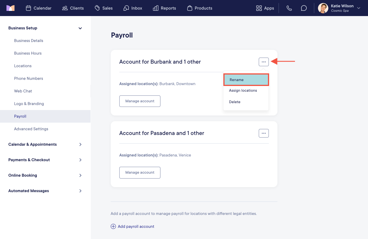 To rename a payroll account, select Rename from the "..." menu. This is helpful if you’d like to give each payroll account a custom name.