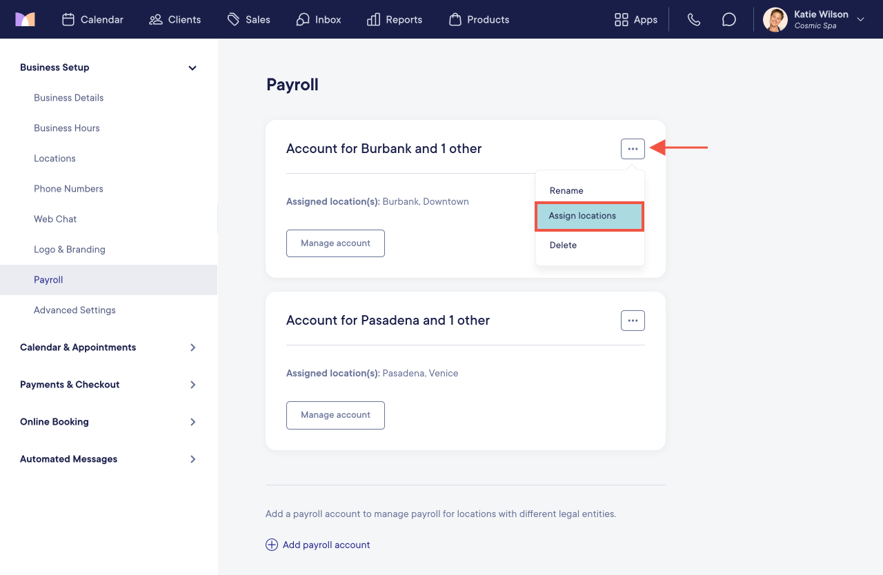 If you need to change the assigned locations for a payroll account, select Assign locations from the "..." menu.
