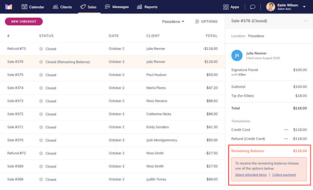 When refunding a single payment, you will only be able to refund to the original payment method or to the client’s account balance. If you’d like to refund the payment in a different way, such as cash, you will need to complete the refund from the "..." menu for the sale by using the Refund amount option.