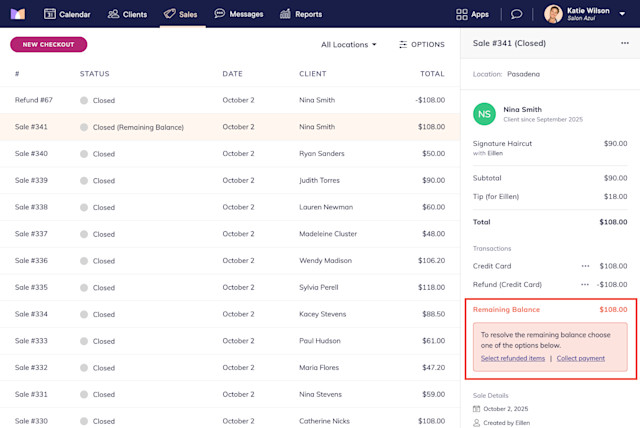 If you chose Collect payment, you can resolve the remaining balance by collecting a new payment for the refunded amount. This is helpful if the client requested a refund so they could use a different payment method.