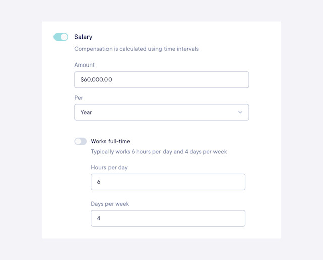 Enable the Works full-time toggle if the staff member works full time (8 hours a day, 5 days a week). If this toggle is disabled, you can specify the hours per day and days per week. This setting helps determine how much to pay the staff member per pay period and how to value time off.