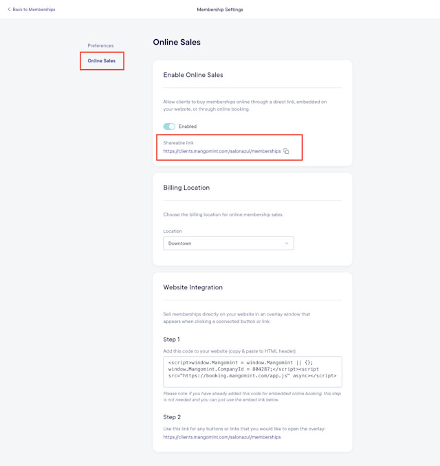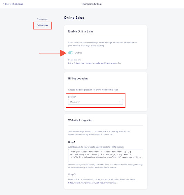 Select the Online Sales tab and enable the toggle for online membership sales. Once enabled, you can also select the billing location for online membership sales if you have multiple locations.