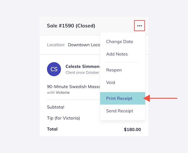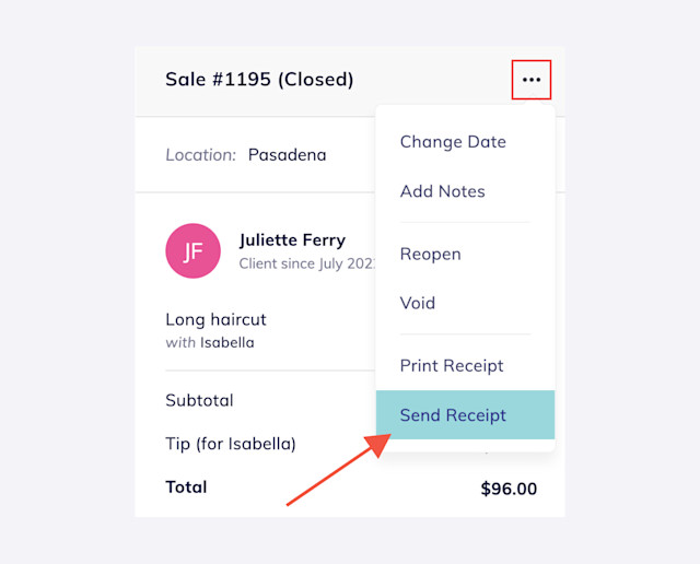 To send a receipt to a client, select the closed sale on the calendar or in the Sales app.