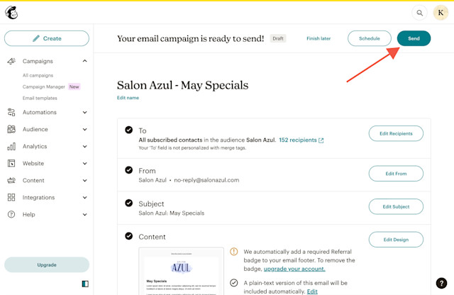 After you’ve completed the To, From, Subject, and Content sections, you should see a checkmark next to each section. This means the email is ready to schedule or send immediately.