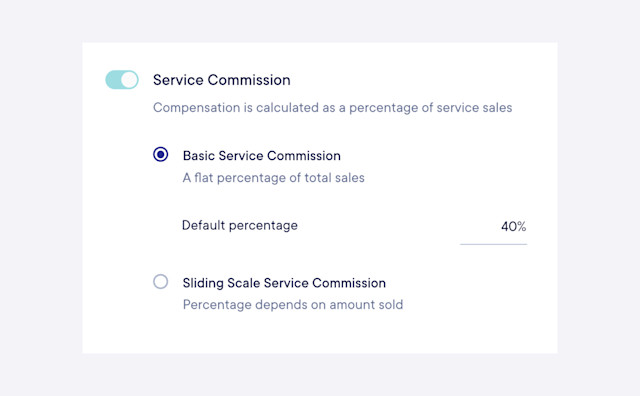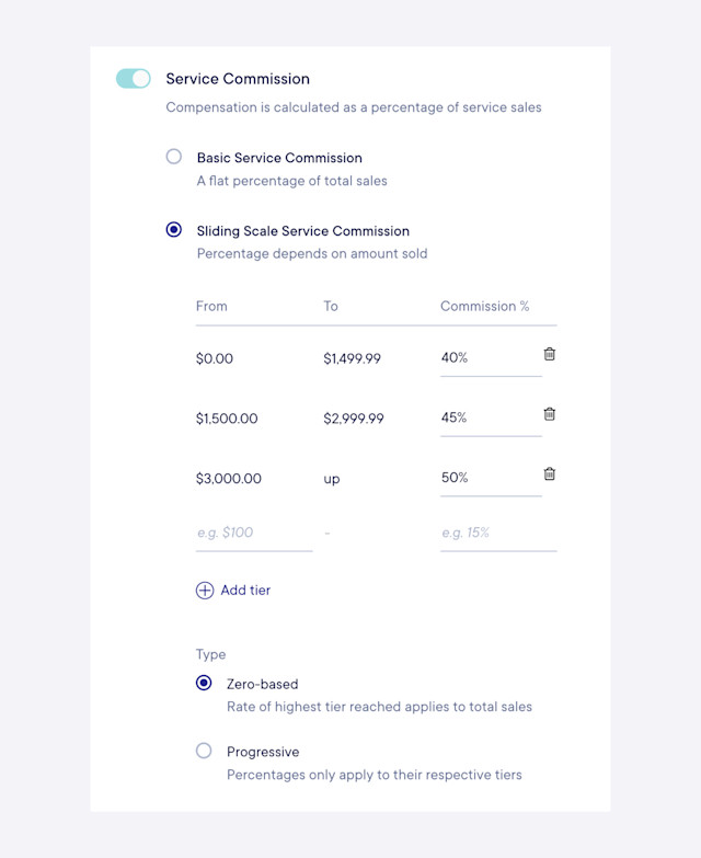 With sliding scale service commission, the percentage depends on the amount sold. This allows you to set multiple percentages for the staff member based on different tiers.