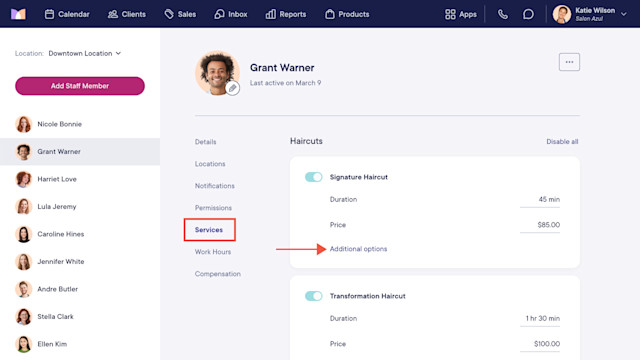 Open the Staff Members app and select the staff member. Select the Services tab and select Additional options.