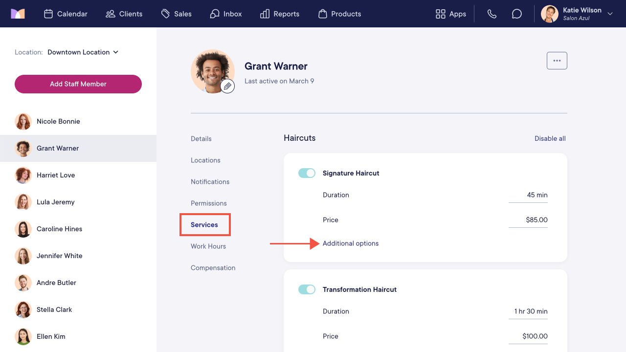 Open the Staff Members app and select the staff member. Select the Services tab and select Additional options.