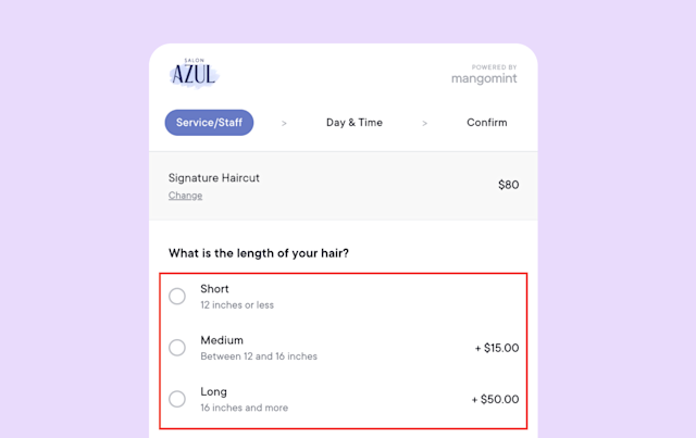 This option changes the service duration: Enable this toggle if this option changes the service duration. The time increments will be the same increments used on the calendar (e.g. 5 or 15 minutes).