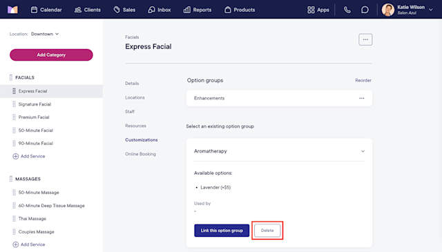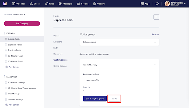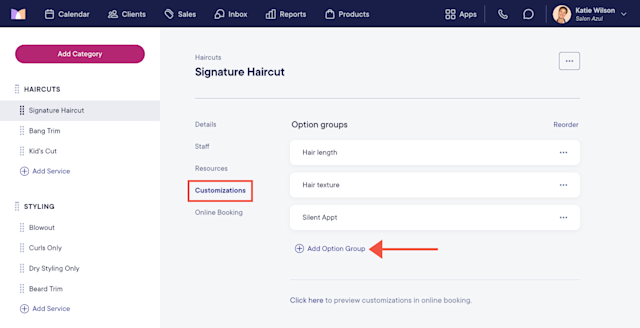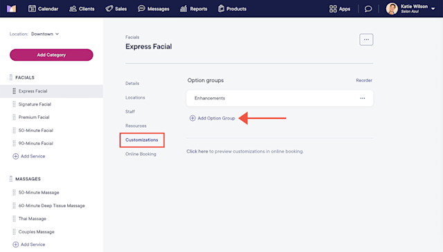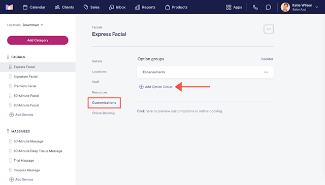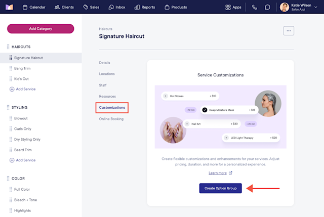 Select Create Option Group (if you already set up a service customization for another service, select Add Option Group > Create New Option Group). Service customizations are organized into option groups. For example, you can create an option group called Aromatherapy and add Lavender, Eucalyptus, and Orange Blossom as options.