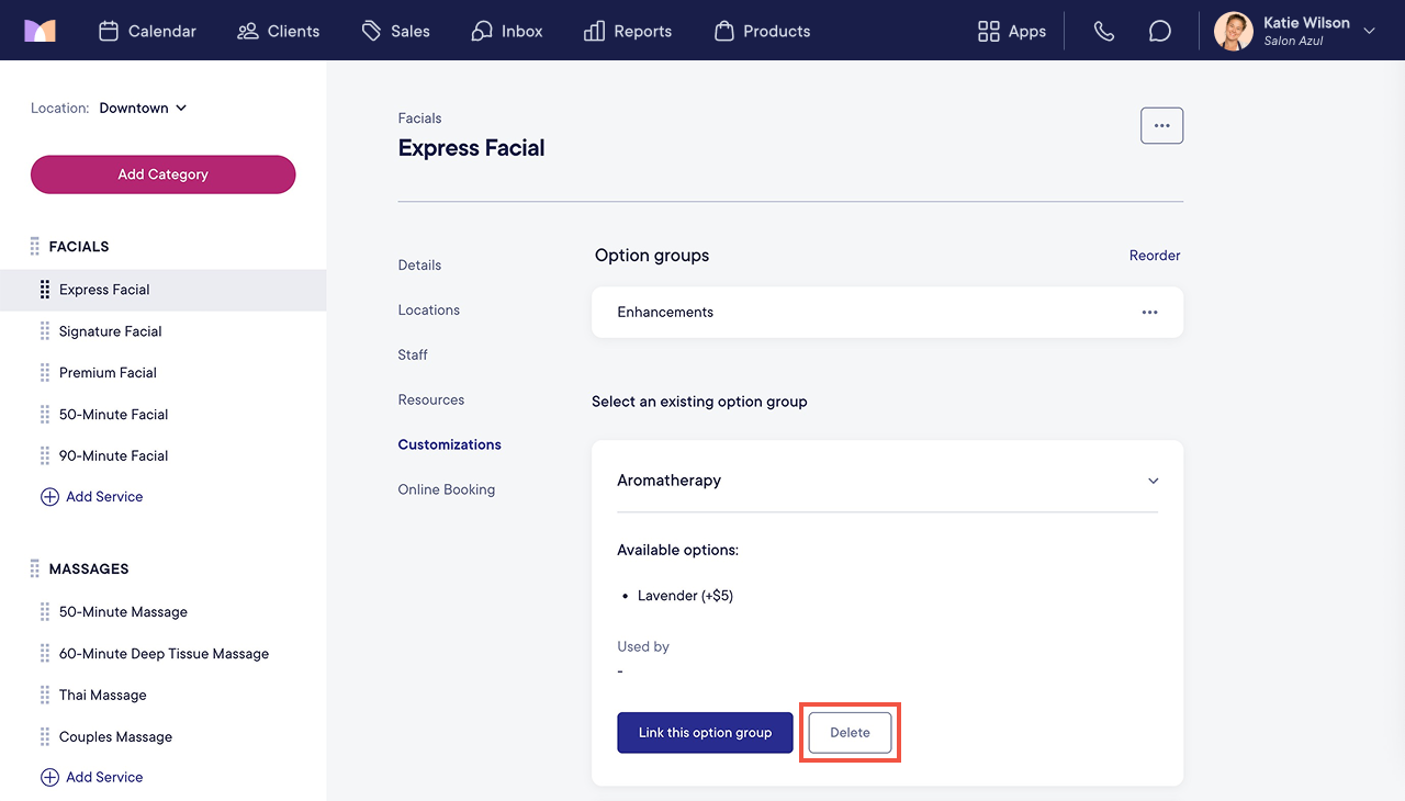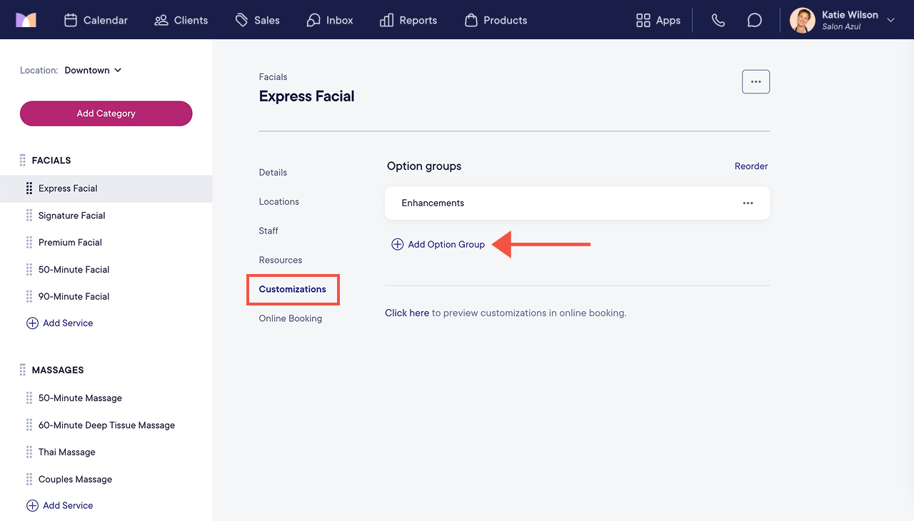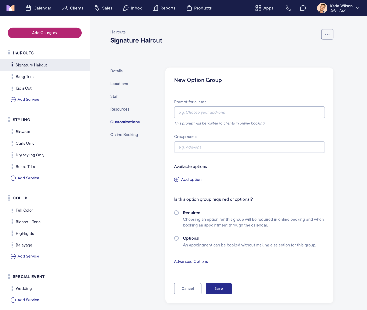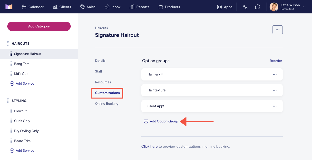 Select Create Option Group (if you already set up a service customization for another service, select Add Option Group > Create New Option Group). Service customizations are organized into option groups. For example, you can create an option group called Aromatherapy and add Lavender, Eucalyptus, and Orange Blossom as options.