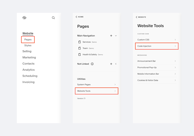 In Squarespace, go to Pages > Website Tools > Code Injection.