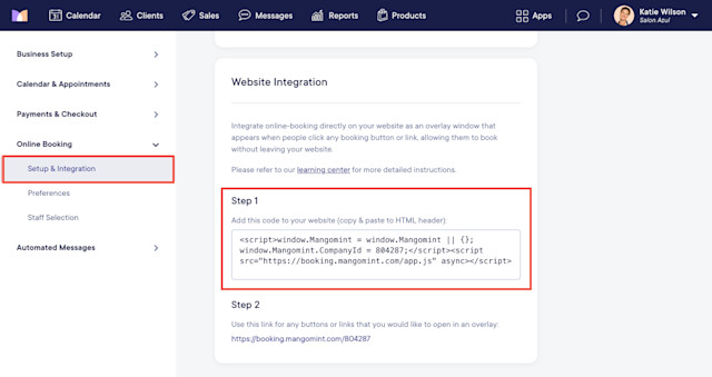 The Mangomint team is available to set up your online booking integration for you for free. Please contact us and we'll complete the integration for you.