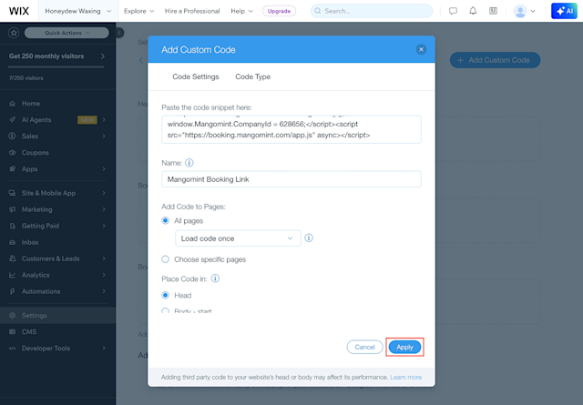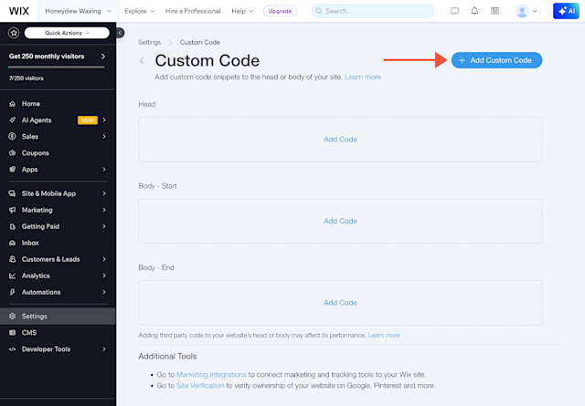 In Wix, go to Settings > Custom code.