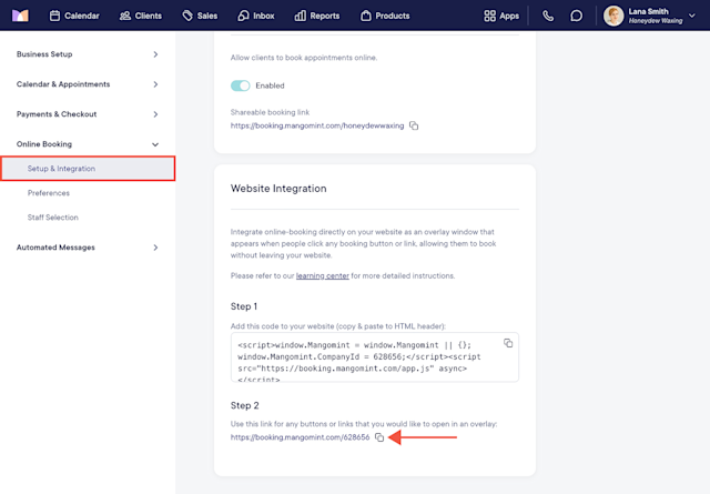 The Mangomint team is available to complete your online booking integration for you. If you would like to complete the integration yourself, follow the steps in this article. If you need help or have any questions, please reach out to chat support.