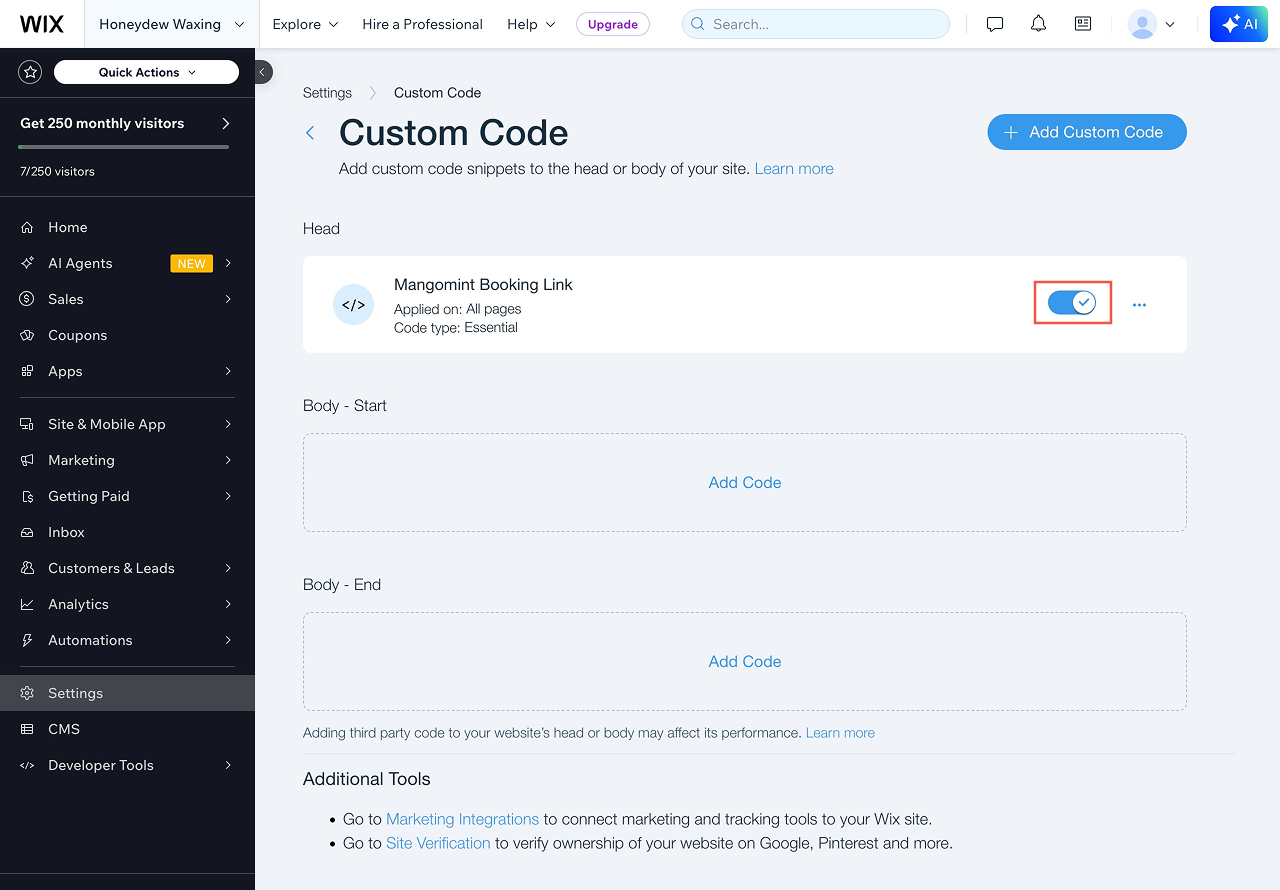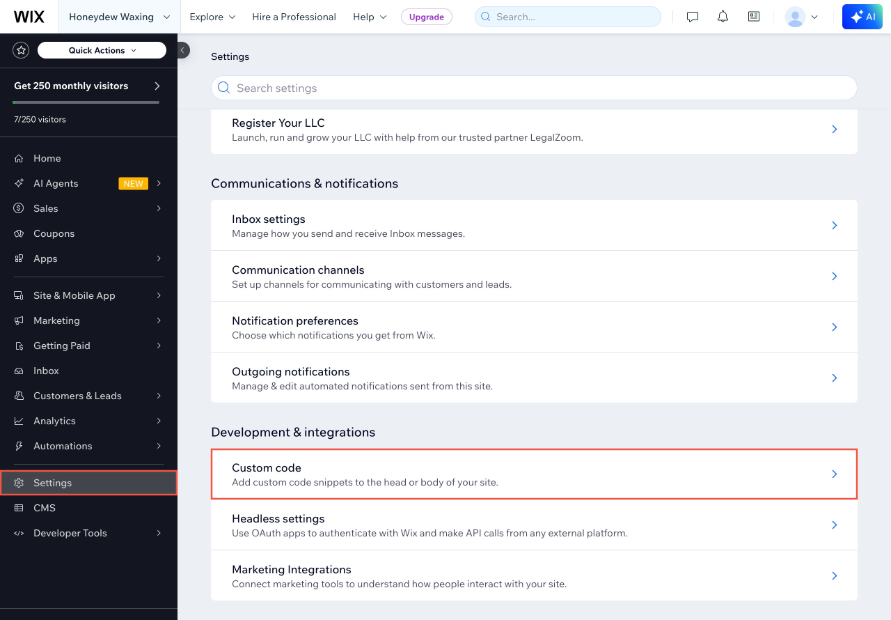 In Wix, go to Settings > Custom code.