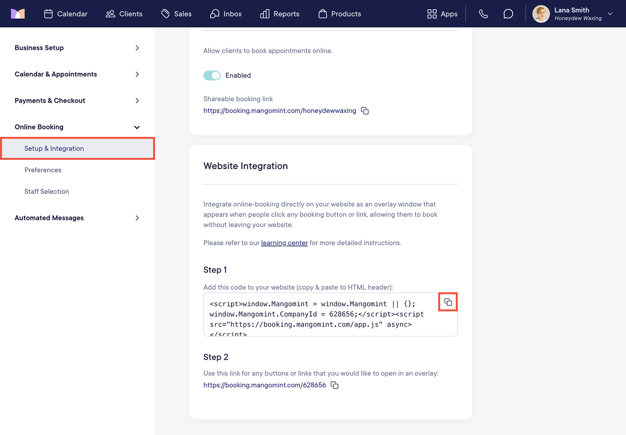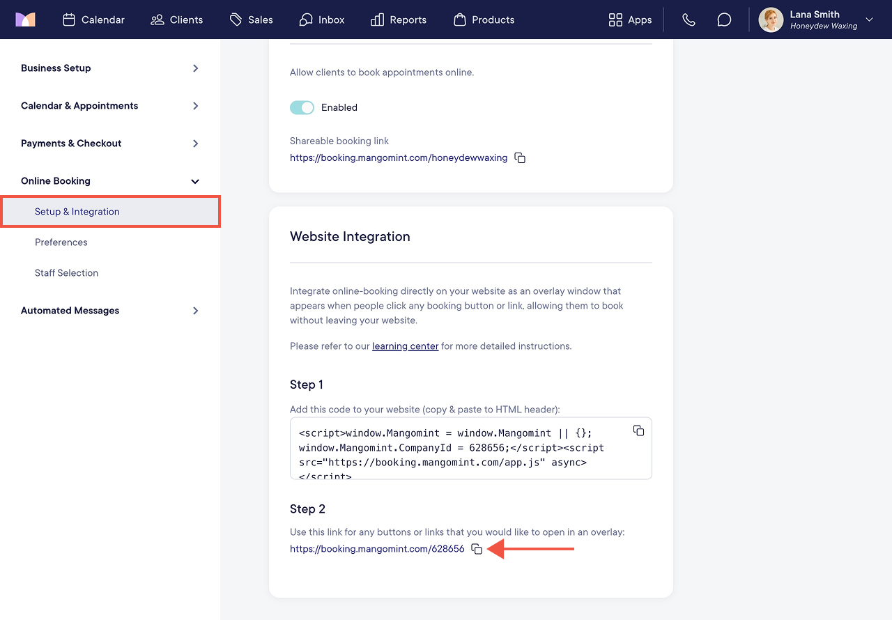 The Mangomint team is available to complete your online booking integration for you. If you would like to complete the integration yourself, follow the steps in this article. If you need help or have any questions, please reach out to chat support.