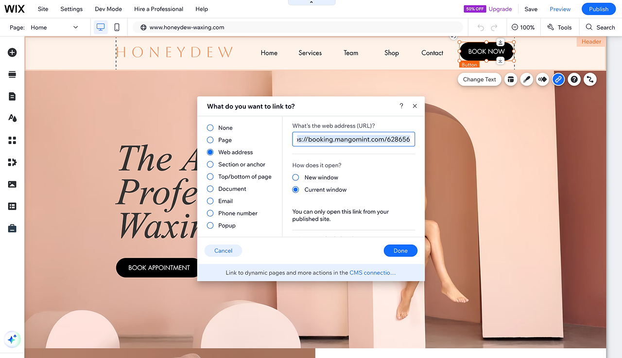 Use the link as the URL for any booking buttons/links on your website to complete the integration. Make sure you set the links to open in the Current window.